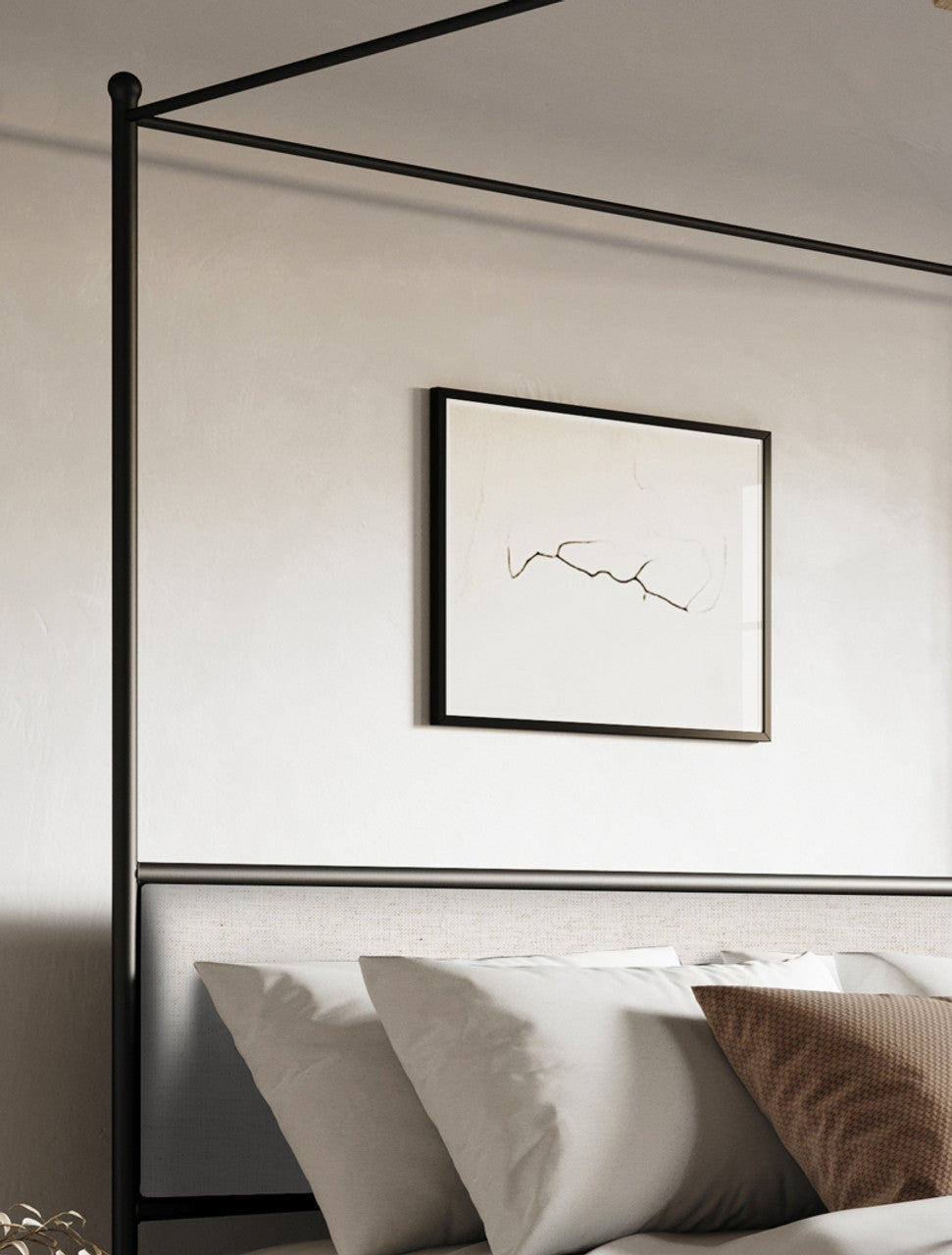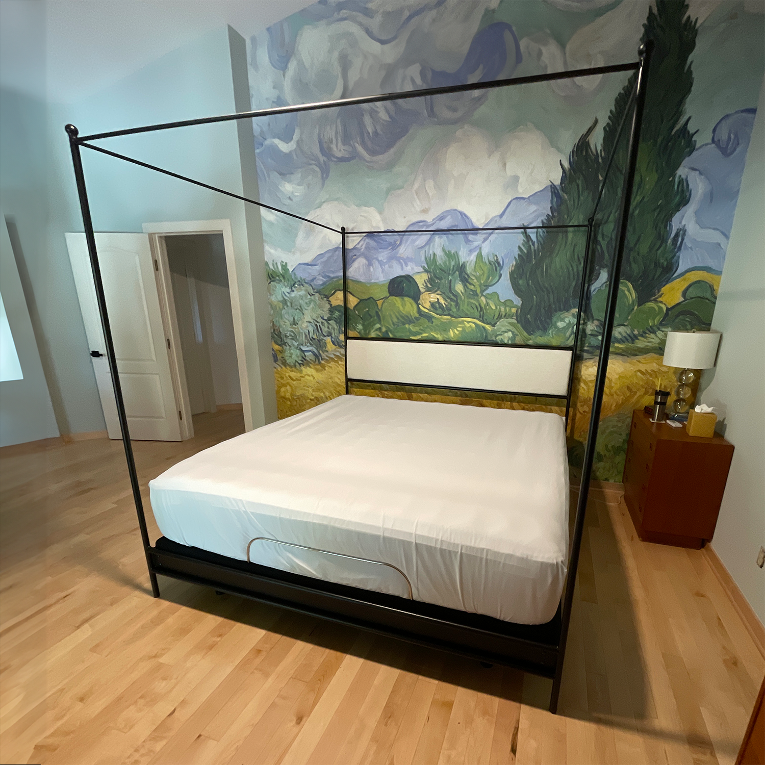 A sleek, hand-forged iron canopy bed with a plush cushioned headboard... blending modern lines, timeless craftsmanship, and customizable American-made quality.
