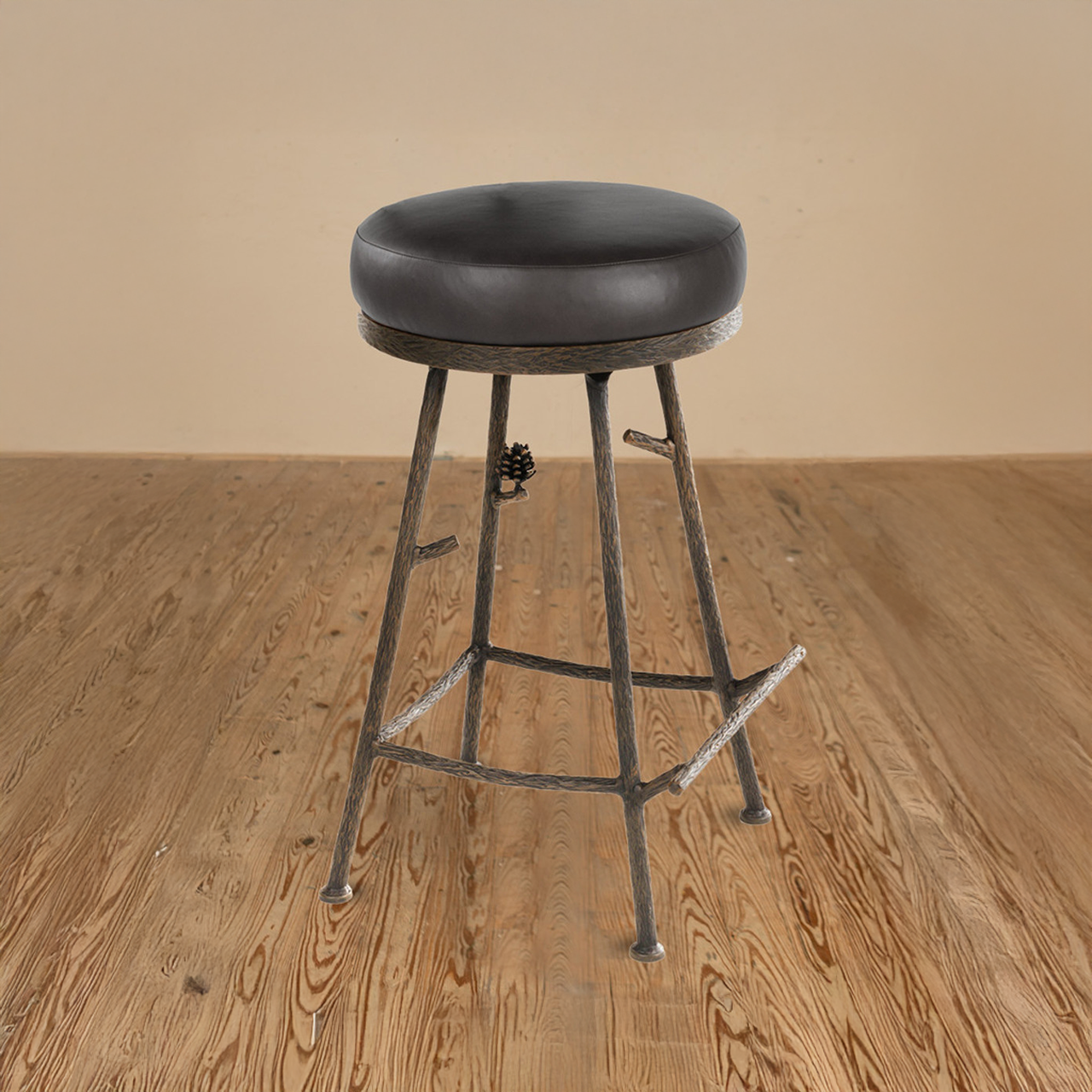 A backless stool with hand-forged branches, pinecones, and needles... capturing the spirit of the forest with the strength of iron.