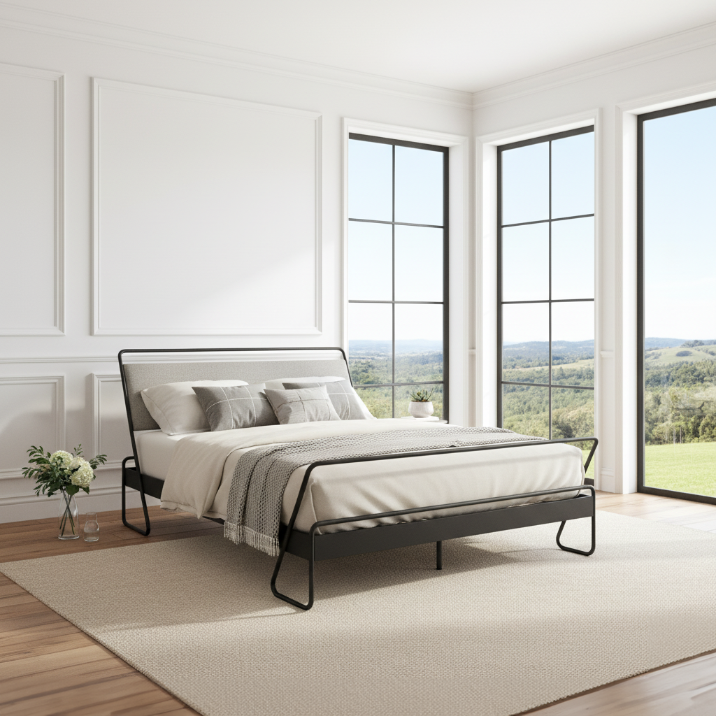 The Alma platform bed features clean, continuous iron lines and a reclined cushioned headboard... an artisan-crafted blend of modern design and everyday comfort.