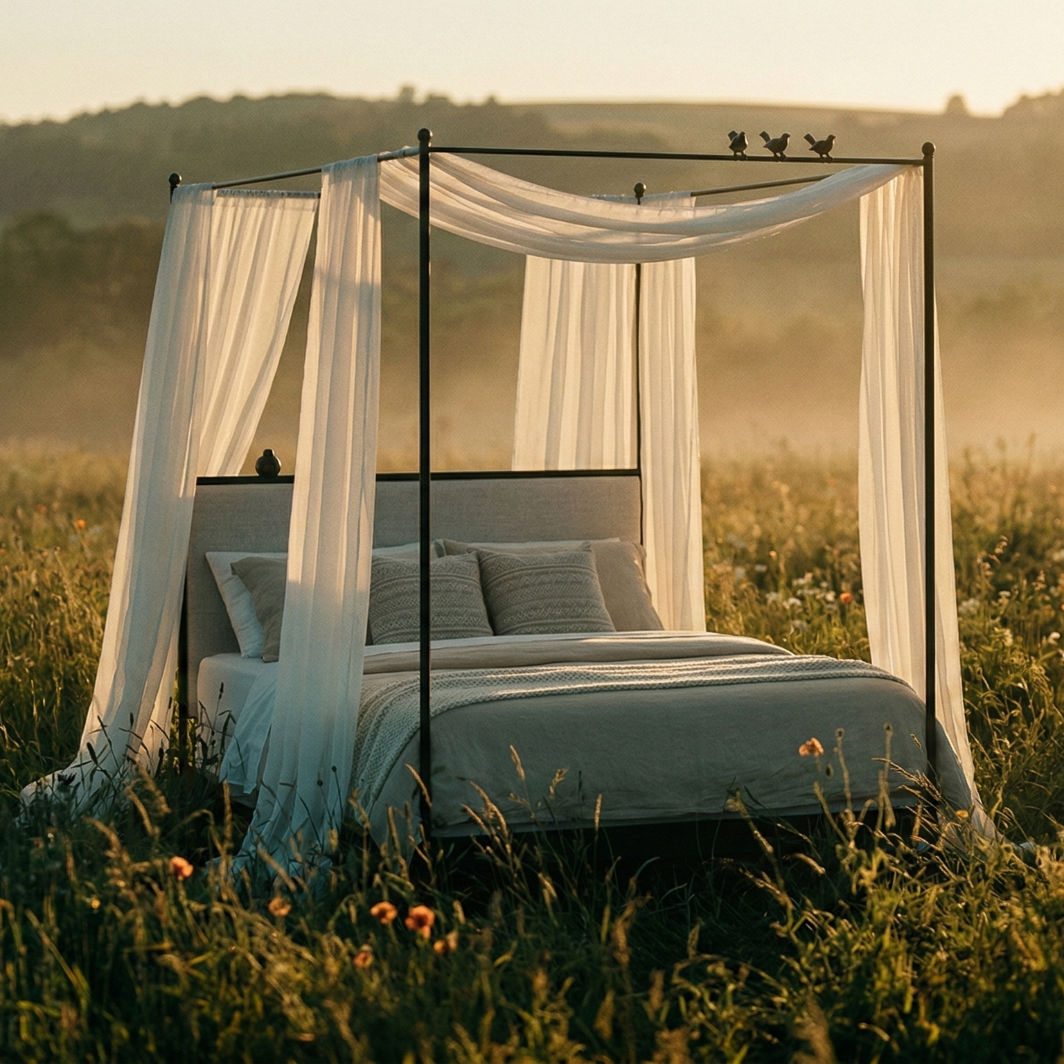 A graceful hand-forged canopy bed with elegant lines and playfully perched iron birds... crafted by American blacksmiths for timeless beauty and heirloom strength.