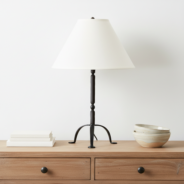 Our Diaz iron table lamp showcases the perfect balance between structural grace and artisanal craftsmanship. Hand-forged in the Ozark Mountains, each lamp begins as solid iron, shaped under the hammer’s rhythm into gently curved legs and a slender central post. The post is formed using a blacksmithing method known as a quadruple fuller... a demanding process that tapers the metal by hand, creating a beautifully sculpted, seamless silhouette.