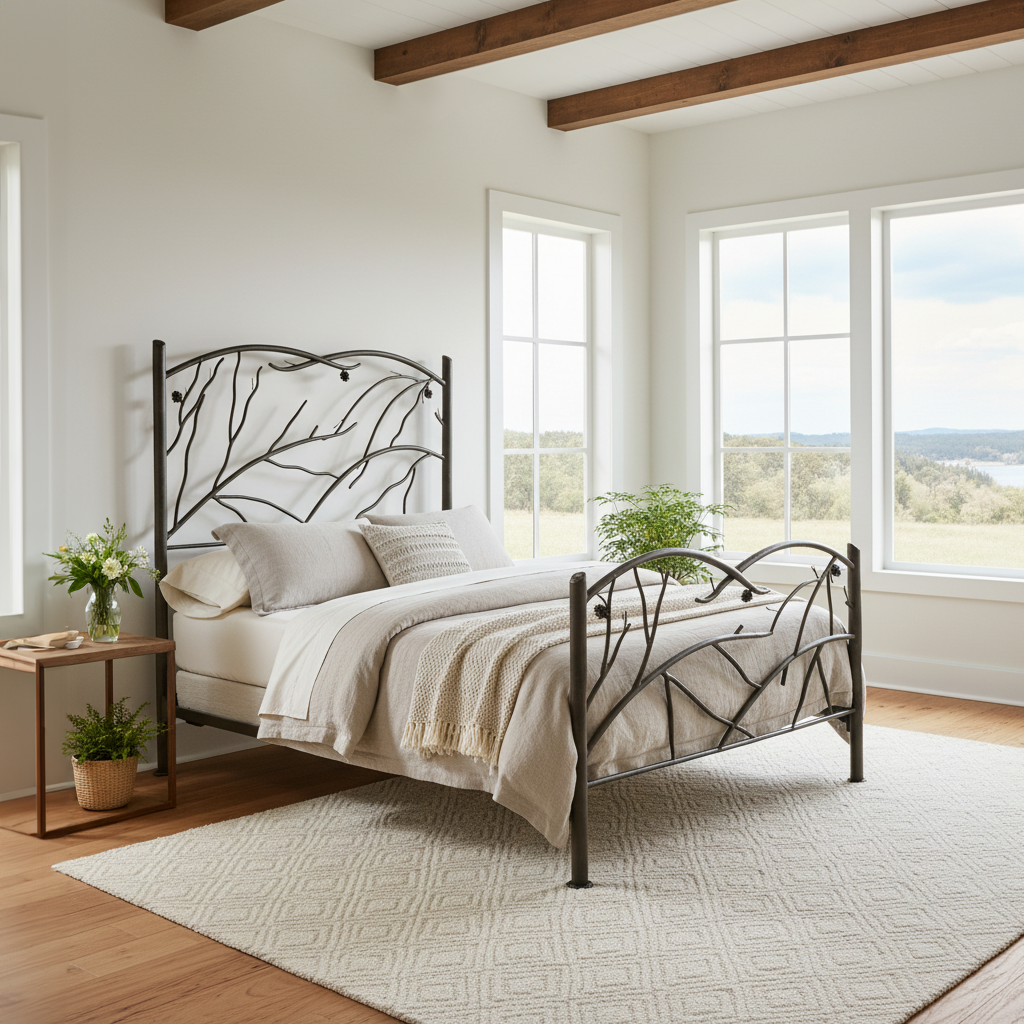Each bed is individually crafted in our Arkansas forge by skilled blacksmiths who use traditional techniques to bring raw iron to life. Every branch and detail is shaped by hand, making no two Evergreen beds exactly alike: just as in nature, each one carries its own unique rhythm and character.