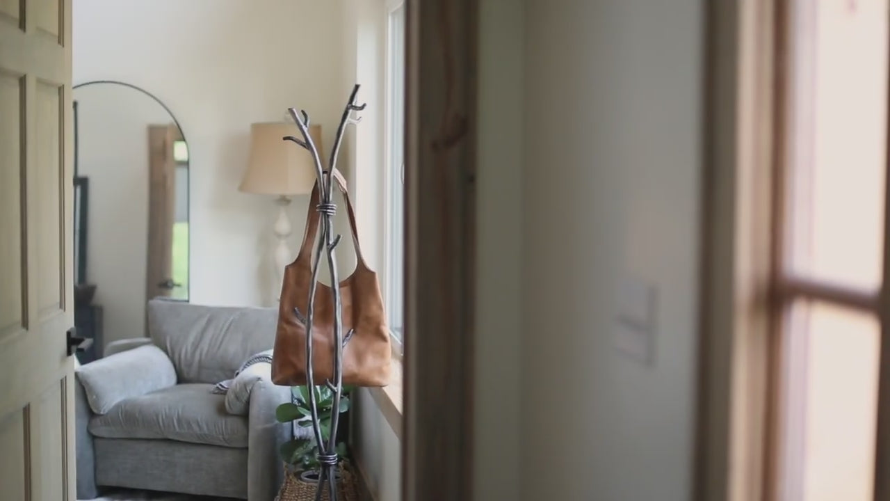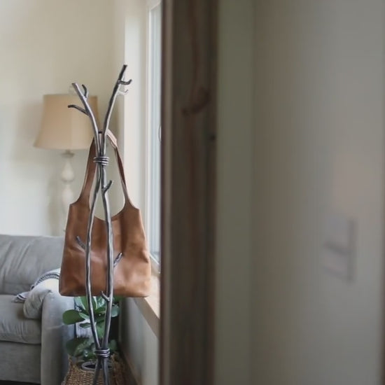 Our Sylamore hand-forged iron standing coat rack combines utility with timeless artisan design. Inspired by the graceful form of slender branches, its upright iron posts are gathered and secured with hand-forged wraps, creating a natural silhouette that feels both rustic and refined. Delicate curves provide multiple hooks for coats, scarves, hats, or bags, while a sturdy tripod base ensures lasting stability with easy glider inserts to protect your flooring.