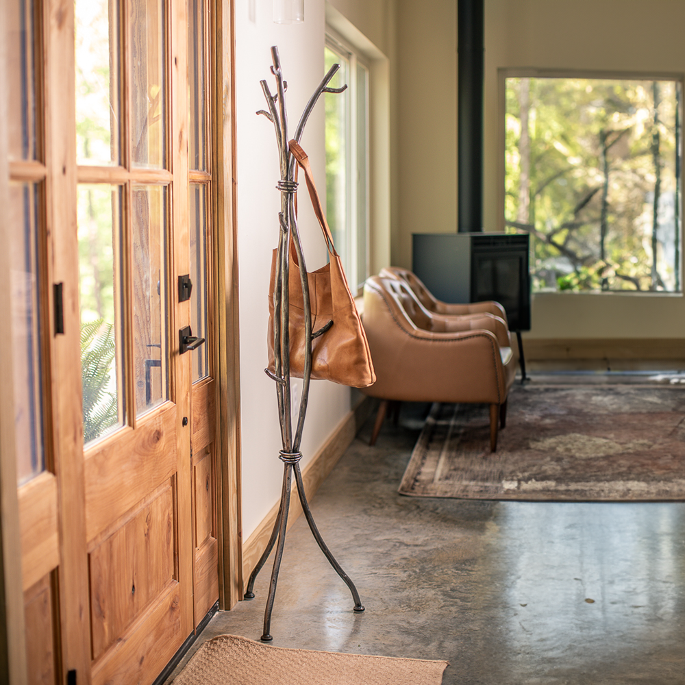 Our Sylamore hand-forged iron standing coat rack combines utility with timeless artisan design. Inspired by the graceful form of slender branches, its upright iron posts are gathered and secured with hand-forged wraps, creating a natural silhouette that feels both rustic and refined. Delicate curves provide multiple hooks for coats, scarves, hats, or bags, while a sturdy tripod base ensures lasting stability with easy glider inserts to protect your flooring.